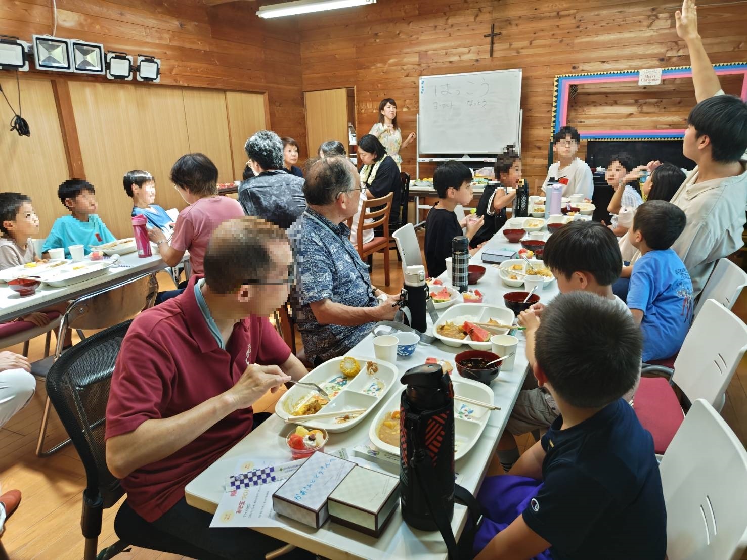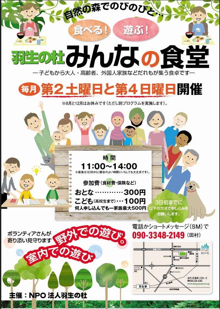 自然の雑木林でのびのびと子どもから大人、高齢者、外国人家族など誰もが集う「みんなの食堂」です。お弁当のテイクアウトと食卓を囲む食堂の併設。何人申し込んでも一家族最大500円です。